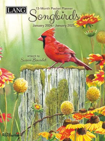 The 2024 Songbirds Monthly Pocket Planner features monthly artwork of cheerful birds famous for their colors and their songs by Susan Bourdet in a 13-month portable format that fits in any pocket or purse.